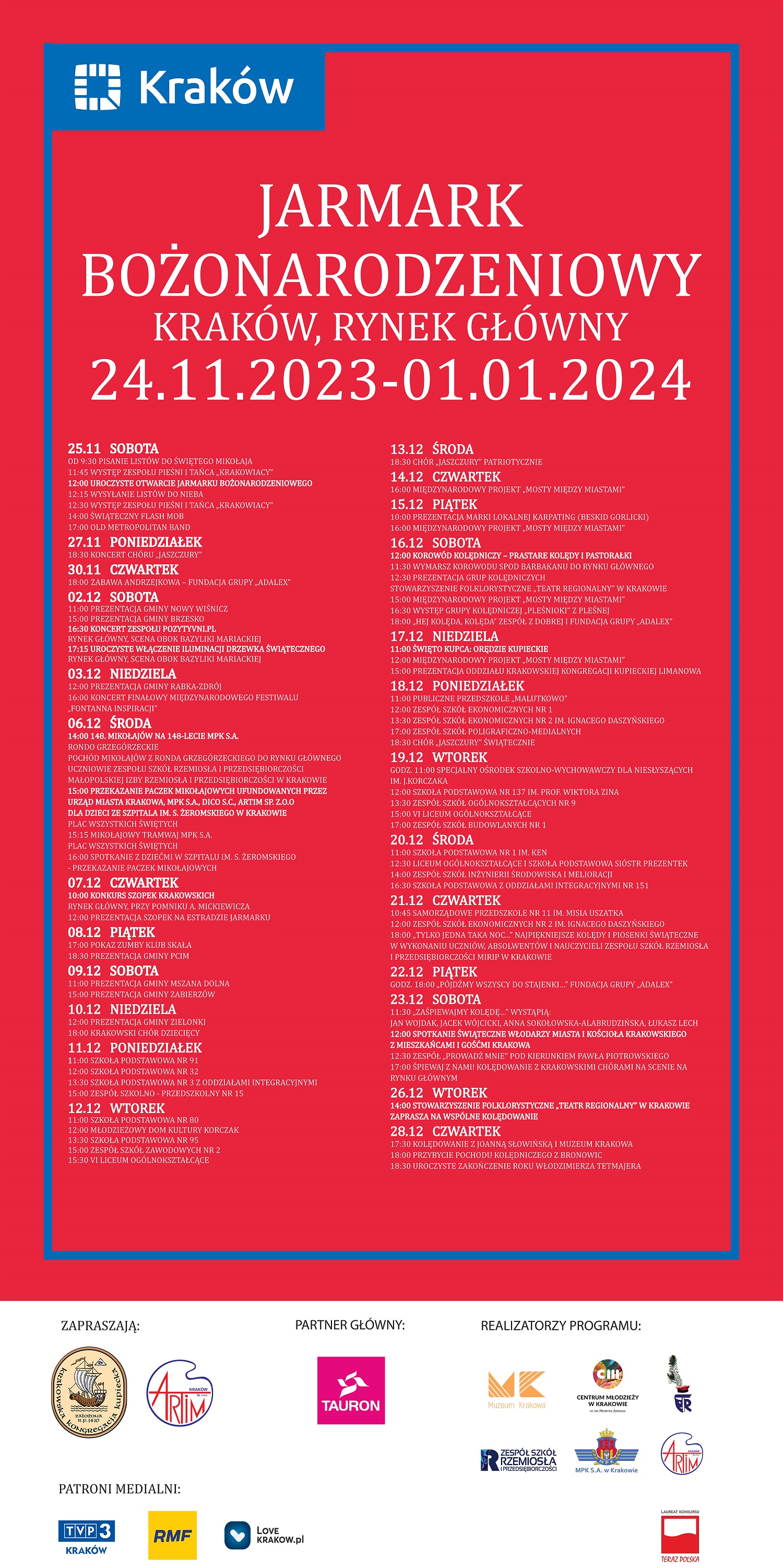 Tegoroczny Krakowski Jarmark Bożonarodzeniowy rozpocznie się w sobotę 25 listopada o godzinie 9:30 tradycyjnym pisaniem listów do Świętego Mikołaja. Tuż po nim nastąpią występy zespołów pieśni i tańca oraz oficjalne, uroczyste otwarcie Jarmarku. W kolejnych dniach na odwiedzających czekać będą atrakcje muzyczne, prezentacje okolicznych gmin i szkół oraz wspólne śpiewanie kolęd.
