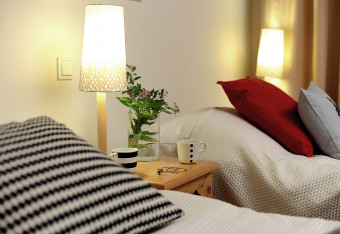 W pokoju na naszych Gości zawsze czeka powitalny zestaw do parzenia herbaty, a w łazience: komplet ręczników, suszarka do włosów oraz ekodozownik z mydłem do rąk.