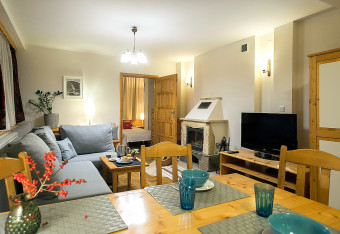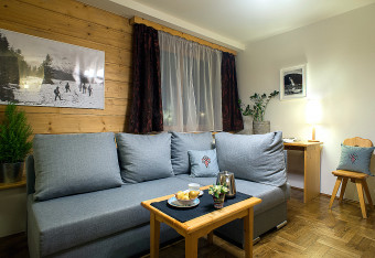Spokój i kameralną atmosferę w apartamentach zapewniają dwie oddzielne sypialnie. W salonie natomiast znajduje się kamienny kominek opalany drewnem, który w chłodne dni, będzie dodatkowo ogrzewał apartament, a wieczorami roztoczy romantyczną atmosferę. Z okien apartamentów można podziwiać widok na Giewont lub Gubałówkę.